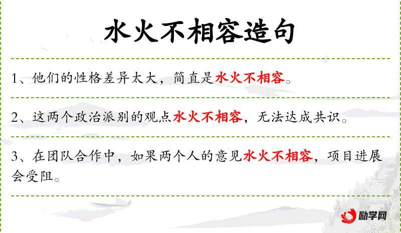 3. 【水火不相容】 - 容:容纳。比喻二者对立,绝不相容。