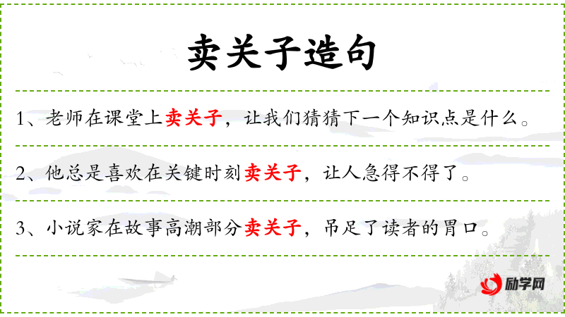 - 相关成语:“欲擒故纵”(故意先放开他,使他放松戒备,充分暴露,然后再把他捉住)与“卖关子”有相似的策略性含义。