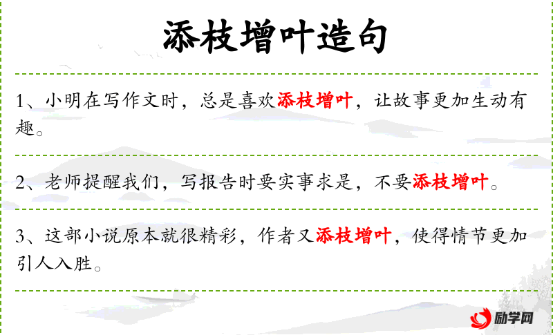 4. 【添枝增叶】 - 比喻接连不断地附加。同“添枝接叶”。