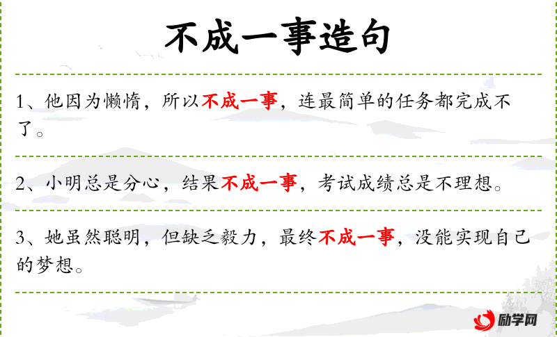 1. 【不成一事】 - 连一样事情也没有做成。指什么事情都做不成。形容毫无成就。