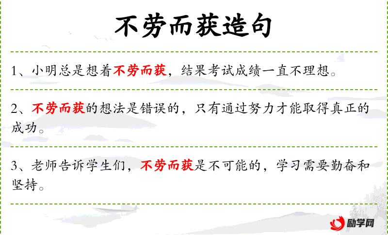 - 可以改写为:“小明的考试成绩一直不佳,因为他总是幻想不劳而获。”