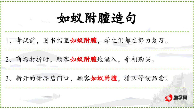 这个句子描述了考试前学生们为了备考而在图书馆里忙碌复*的情景。这里的“如蚁附膻”形象地描绘了学生们密集且忙碌的状态,反映了考试压力下学生们的高度集中和努力。