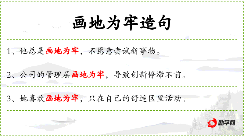 1. 【画地为牢】 - 在地上画一个圈当做监狱。比喻只许在指定的范围内活动。