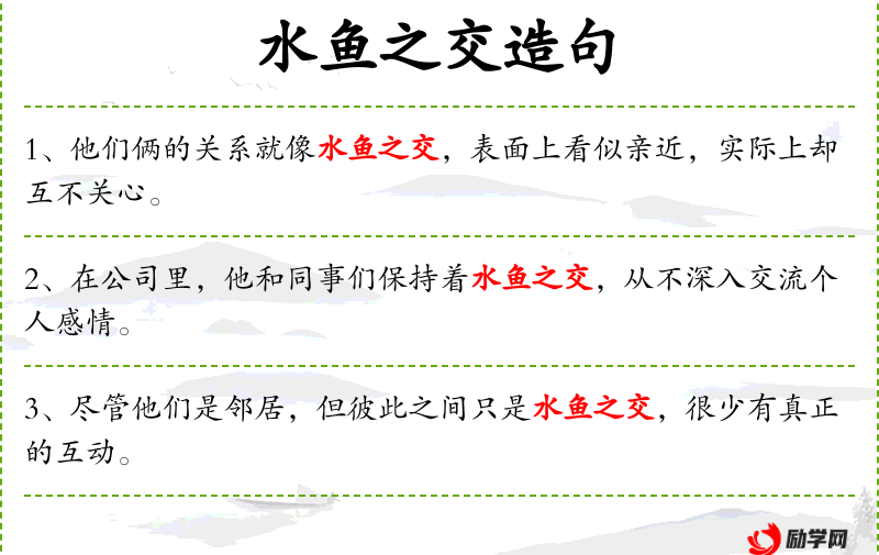 4. 【水鱼之交】 - 指像鱼和水二者的关系一样。旧时指君臣之间或夫妻之间的情谊。