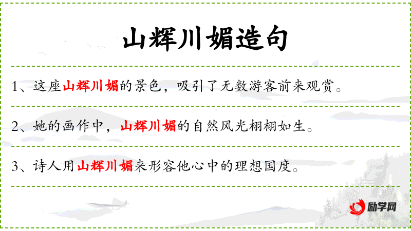 - 山辉川媚:形容词短语,形容山川美丽动人。