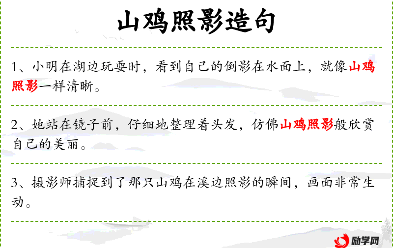 “山鸡照影”可能源自**传统文化中的自然美学,强调自然景物的和谐与美丽。这种表达方式体现了对自然景观的细腻观察和深刻感受。