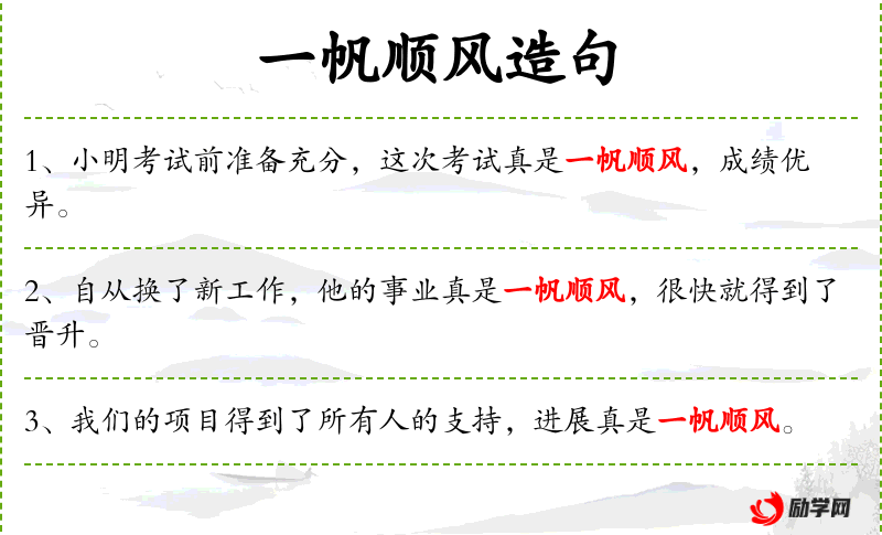 1. 【一帆顺风】 比喻非常顺利,没有任何阻碍。同“一帆风顺”。