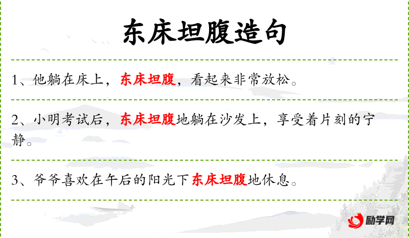 - “东床坦腹”源自**古代文化,形容人躺卧的舒适姿态。