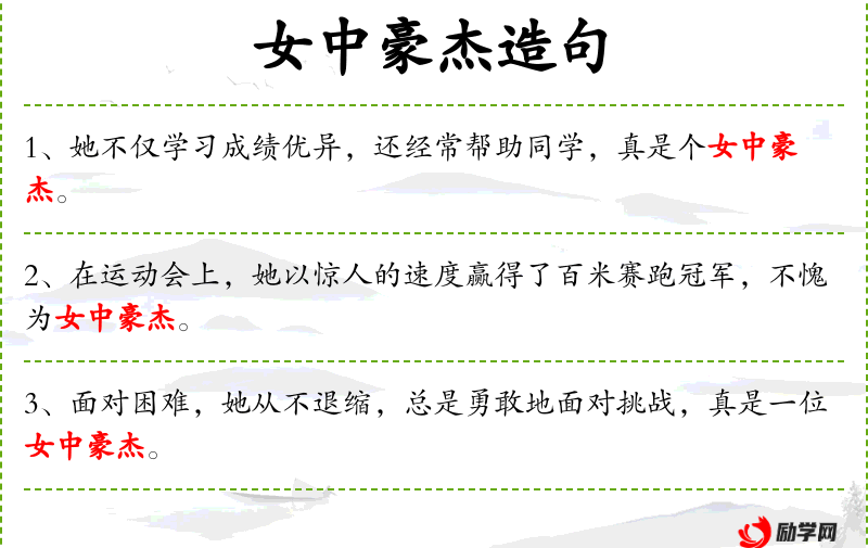 - 女中豪杰:名词短语,指女性中的杰出人物。