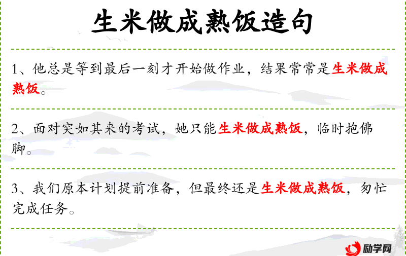 6. 【生米做成熟饭】 比喻事情已经做成了,不能再改变。