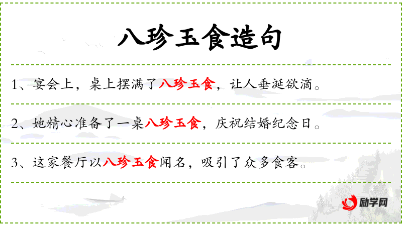 - 变体句:八珍玉食,古代皇宫贵族的专享美食。
