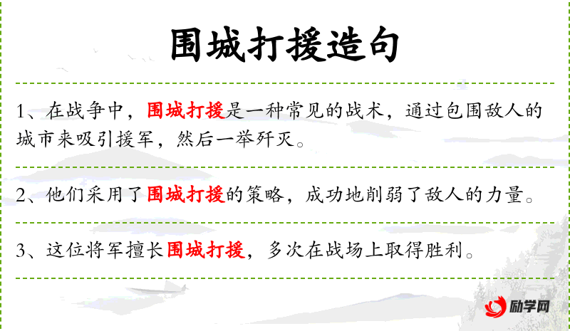 - 围城打援:一种军事战术,意指在围困敌方城市的同时,打击敌方的援军。