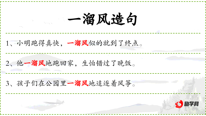 - 一溜风地:副词短语,形容动作迅速、轻快。