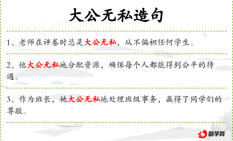 - 大公无私:形容词短语,形容一个人做事公正无私。