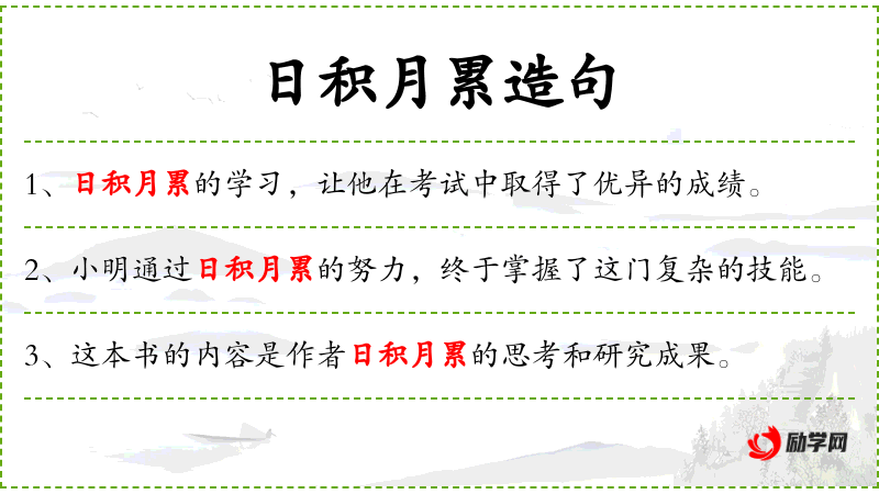 5. 【日积月累】 一天一天地、一月一月地不断积累。指长时间不断地积累。
