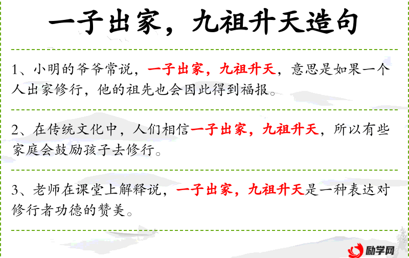 句子:“在家庭聚会上,长辈们常常用一子出家,九祖升天来教育年轻一代要懂得感恩和奉献。”