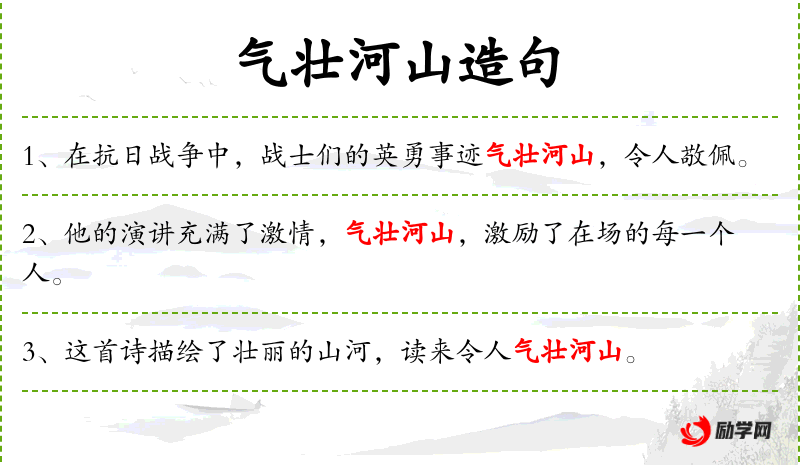 3. 【气壮河山】 - 形容气概豪迈,使祖国山河因而更加壮丽。同“气壮山河”。