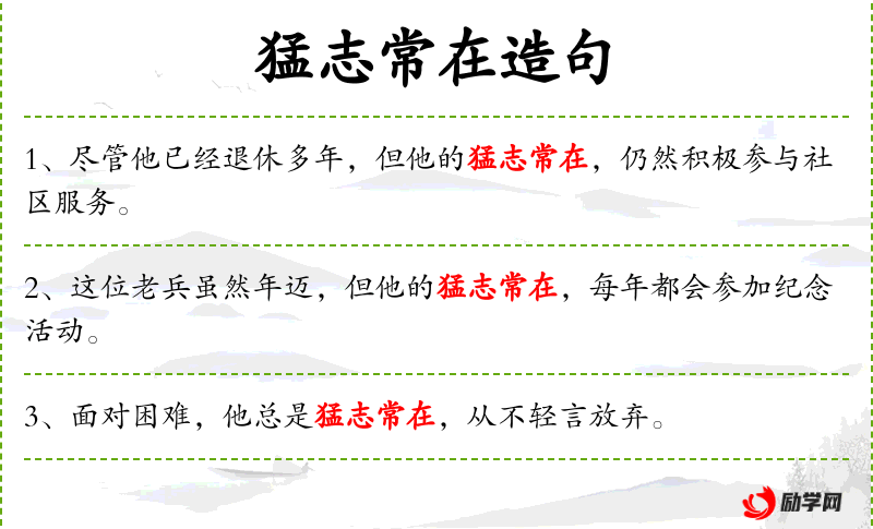 1. 【猛志常在】 - 比喻雄心壮志,至死不变。
