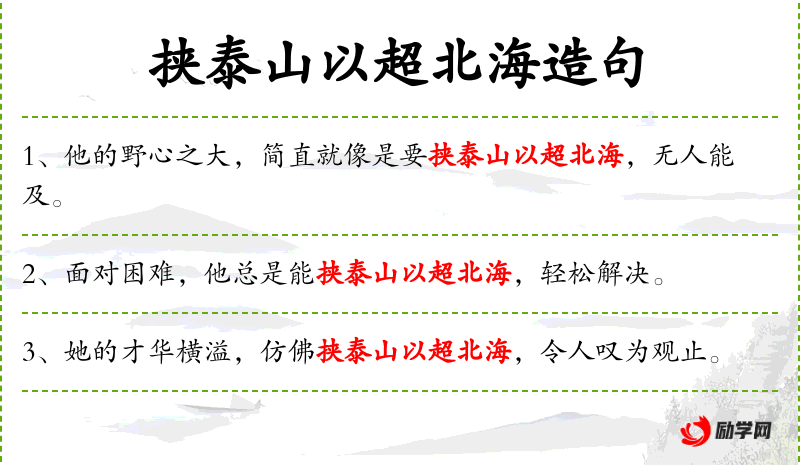 - 挟泰山以超北海:出自《庄子·逍遥游》,比喻能力极大,能够轻易完成看似不可能的任务。
