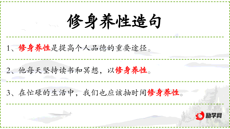 - 修身养性:指通过自我修养和培养良好的品德来提高个人的道德水平和精神境界。