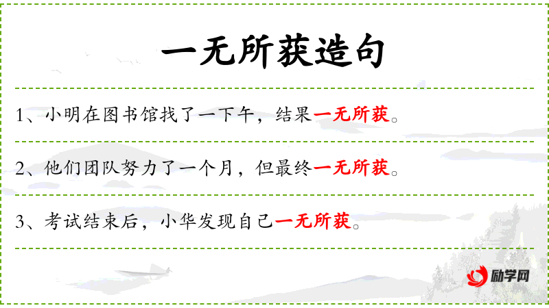 1. 【一无所获】 一无:全无。什么东西都没有获得。