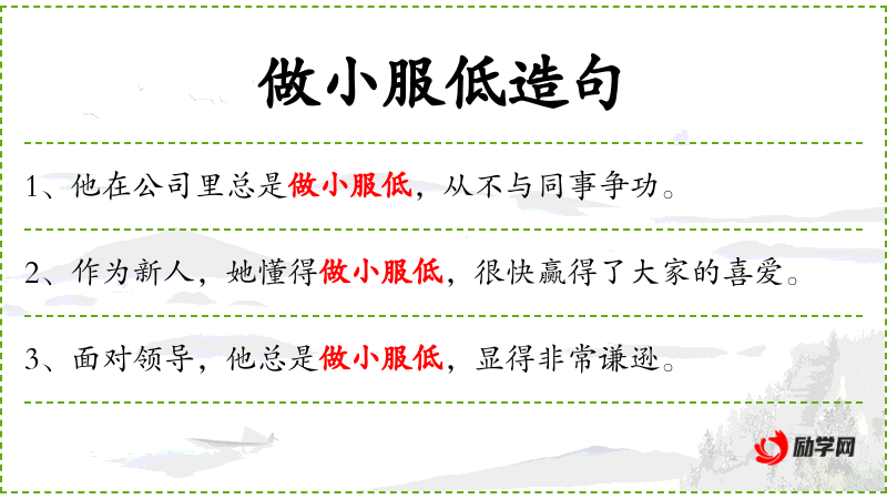 - 做小服低:表示谦逊、低调,愿意做小事,不张扬。