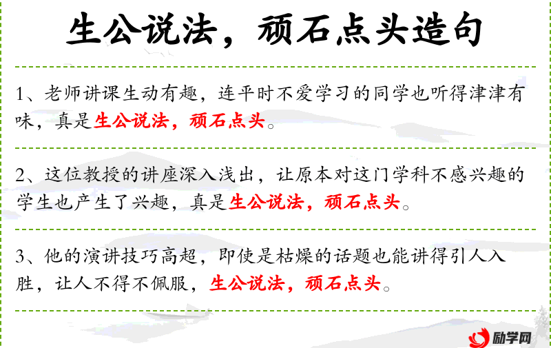 5. 【生公说法】 生公:晋末高僧竺道生,世称生公。竺道生解说佛法,能使顽石点头。比喻精通者亲自来讲解,必能透彻说理而使人感化。