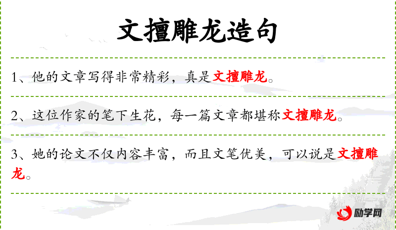 - 文擅雕龙:这个成语源自**古代,比喻文笔高超,能够写出精妙绝伦的文章。