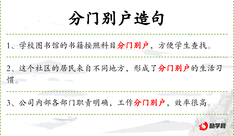 - 成语典故:“分门别户”源自古代家族制度,比喻工作分工细致。