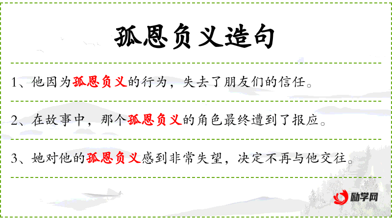 - 孤恩负义:指忘恩负义,不回报别人的恩情,反而做出伤害别人的行为。