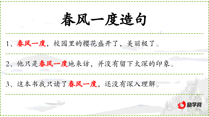 - 春风一度:指春天的风轻轻吹过一次,常用来形容春天的到来或某个季节的短暂变化。