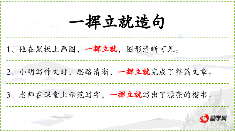 1. 【一挥立就】 - 挥:挥笔;就:成功。一动笔就写成了。形容写字、写文章、画画快。