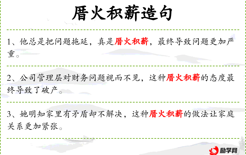 - 厝火积薪:这个成语来源于**古代,原意是指把火种放在柴堆下,比喻不解决问题,反而加剧问题。在现代汉语中,这个成语常用来批评那些不作为或错误作为的行为。