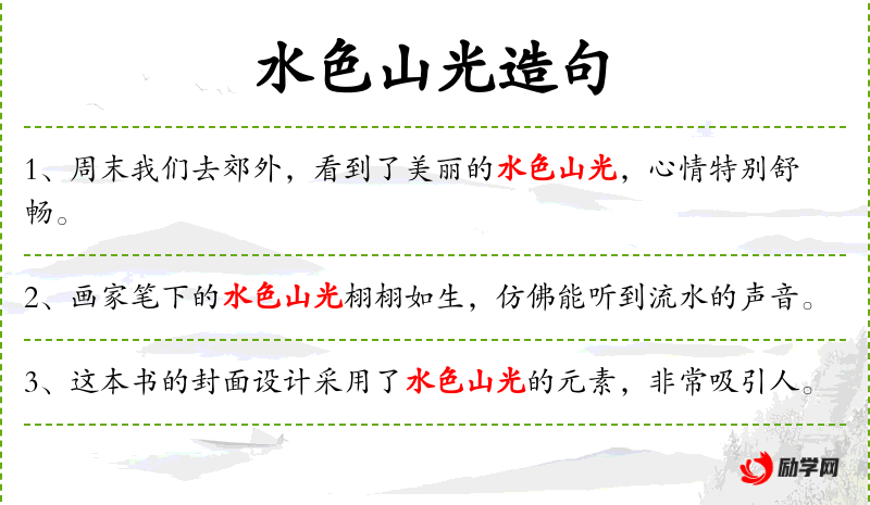 3. 【水色山光】 - 水波泛出秀色,山上景物明净。形容山水景色秀丽。