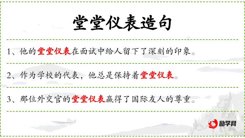- 堂堂仪表:形容人的外表庄重、有威严。