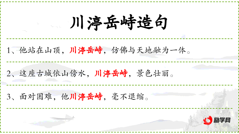 - 川停岳峙:形容词短语,意为像山川一样稳固、不可动摇,常用来形容人的气质沉稳、坚定。