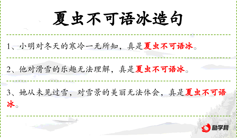句子:“他从未在雪地中行走,对那种感觉真是夏虫不可语冰。”