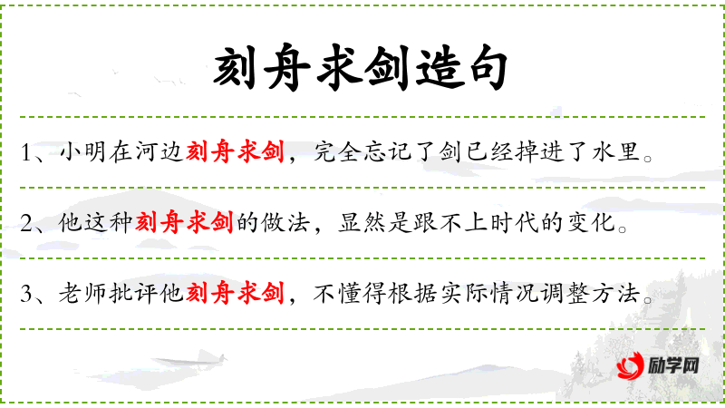 - 刻舟求剑:成语,比喻方法陈旧,不适应变化。