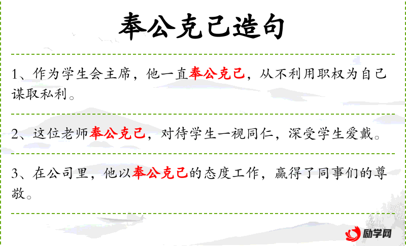 - 奉公克己:指遵守公德,克制私欲,是一个成语,表示遵守公共道德,不自私。