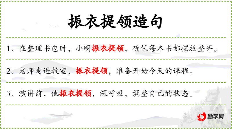 - 振衣提领:这个成语字面意思是整理衣服和领子,比喻做好准备工作。