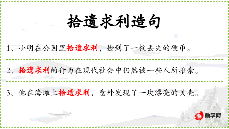 - 拾遗求利:成语,意思是捡拾遗失的东西以谋取利益。