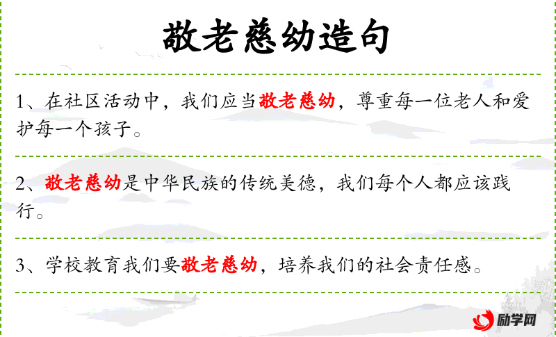 3. 【敬老慈幼】 敬:尊敬;慈:怜爱。尊敬老人,爱护儿童。