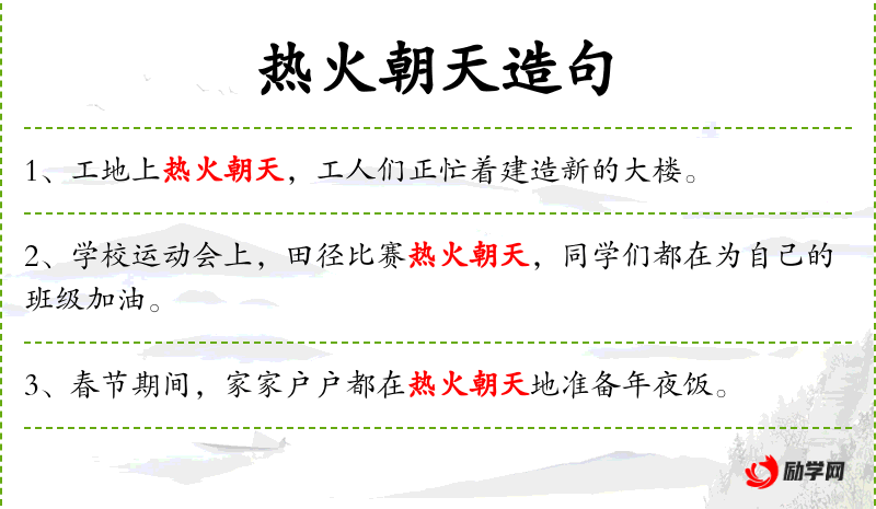 5. 【热火朝天】 - 形容群众性的活动情绪热烈,气氛高涨,就象炽热的火焰照天燃烧一样。