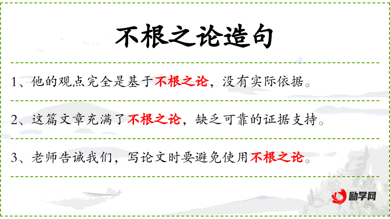 1. 【不根之论】 根:根据;论:言论。没有根据的言论。
