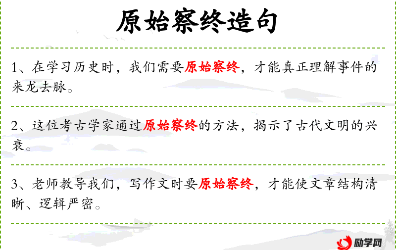 - 原始察终:成语,意为从最初开始观察到最后结束,强调全面和细致。