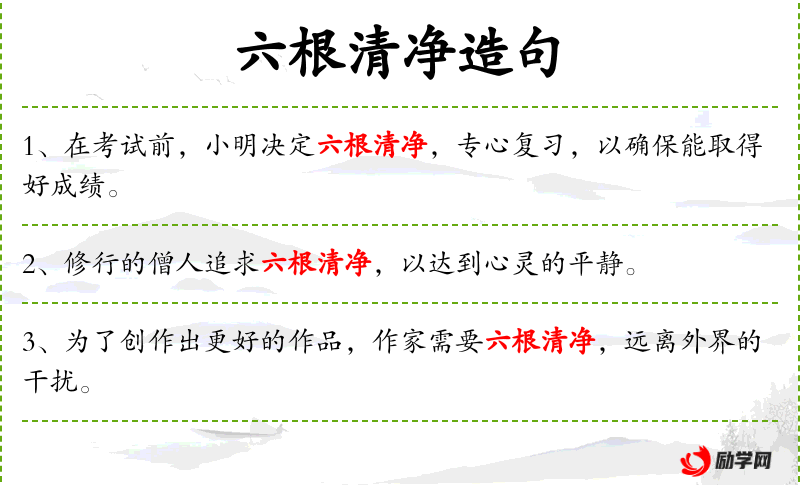 - 六根清净:成语,意指心无杂念,专注于某事。