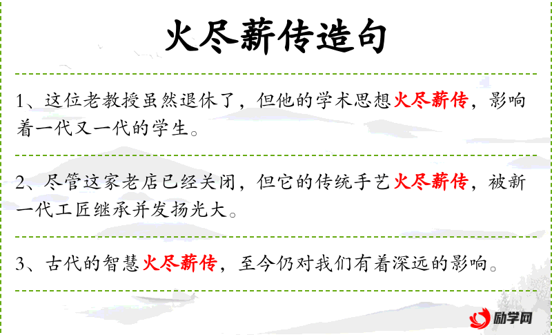 5. 【火尽薪传】 - 火虽烧完,柴却留传下来。比喻思想、学术、技艺等世代相传。