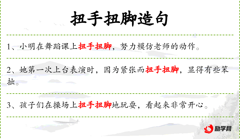 - 扭手扭脚:动词短语,形容动作不自然或笨拙。