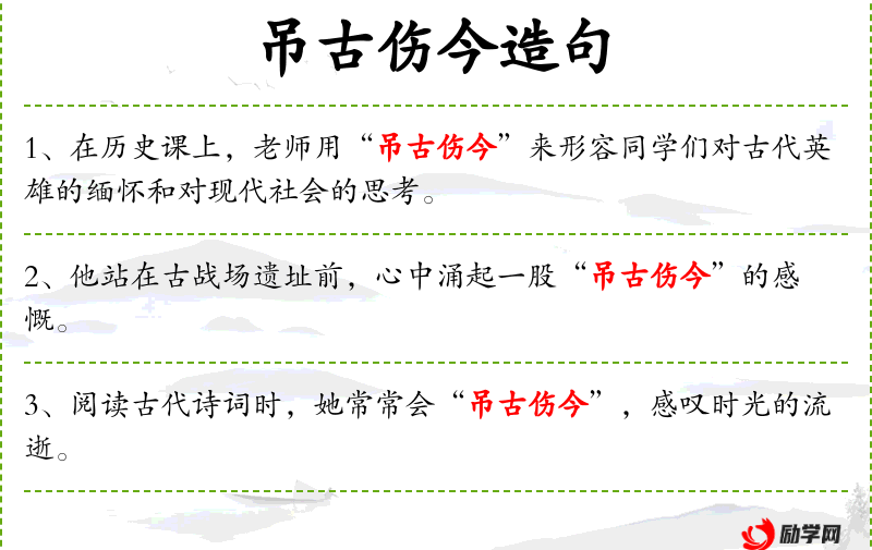 - 吊古伤今:一种文学手法,指通过描写历史来反映现实,表达对过去和现在的感慨。