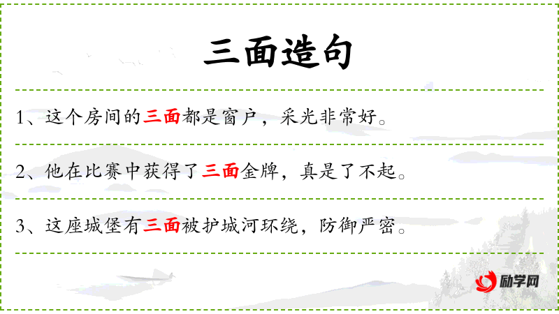 1. 【三面】 - 三个方向,三方面; 指传统戏剧中的丑角。